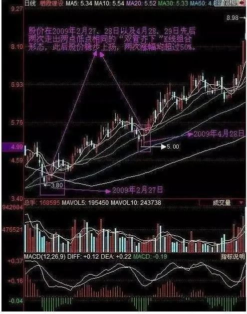 2、两条并列的K线(可以是十字星,也可以是阴线或阳线)的下影线低点应该非常接近,差距不宜过大,否则会降低判断的准确性。