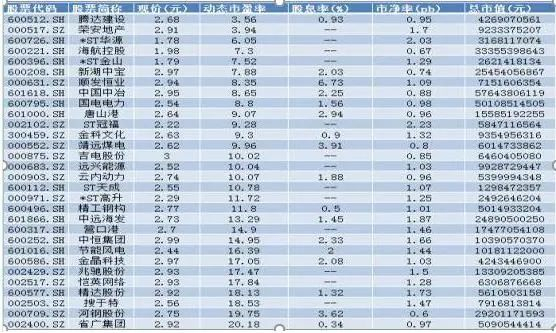 两市三板共计3500余家上市公司,其中3元以下的上市公司有176家,最低价格为1.14元/股。要说投资性,不能说没有,也不能说具有,只能是“仁者见仁智者见智”。为什么这么讲呢?牛市行情来时,绝大部分的股票都会呈现上涨。以下是动态市盈率低于20倍的低价股: