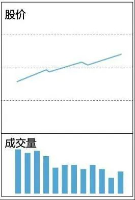 9. 量减价升,一般可继续持有:成交量减少,股价仍在继续上升,适宜继续持股,即使如果锁筹现象较好,也只能是小资金短线参与,因为股价已经有了相当的涨幅,接近上涨末期了。有时在上涨初期也会出现“量减价升”,则可能是昙花一现,但经过补量后仍有上行空间。