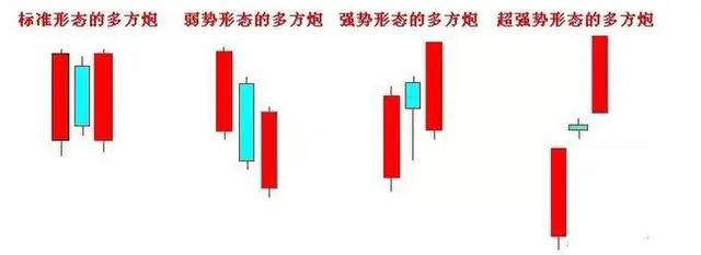 两阳夹一阴既是上涨中继信号,也是底部反转信号,技术特征主要有3点:1)它是由三根K线组合而成;2)第一天收出一个大阳线或中阳线,第二天下行收出一根实体与第一天差不多的阴线,第三天收出一根大阳线或中阳线,实现技术反包;3)两阳夹一阴存在技术变形,强势程度也不相同,如下图所示。