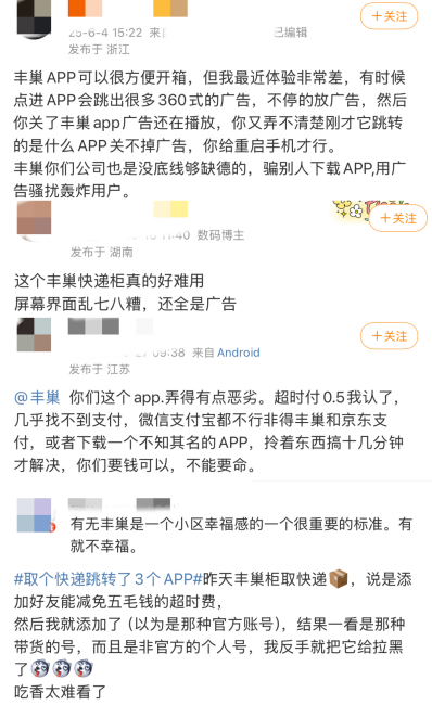 法治网记者调查发现,不少网友在社交平台上吐槽丰巢取件支付体验不佳。网友们反映的问题主要集中在:付款时流程繁琐,扫码后页面出现其他支付平台,选择付款还会跳转并弹出金融广告,诱导下载APP,疑似存在分期付款诱导套路。还以“添加好友减免超时费”等优惠活动为诱饵,用户添加后却发现是个人带货账号。有网友气愤表示,“吃相太难看了”。