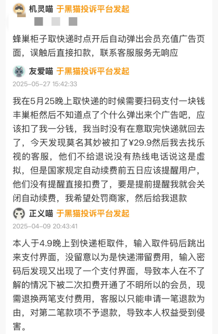 法治网记者检索黑猫投诉平台发现,涉及丰巢快递的投诉达24000多条。不少用户投诉,使用蜂巢取件时广告繁多,取件过程中广告弹窗接连不断。甚至有部分用户投诉,取件时稍不留意误触广告,便会在不知情的情况下被开通App会员并被自动扣费,最终造成经济损失。这些问题严重影响到用户体验,也引发公众对蜂巢取件服务规范及用户权益保障的担忧。