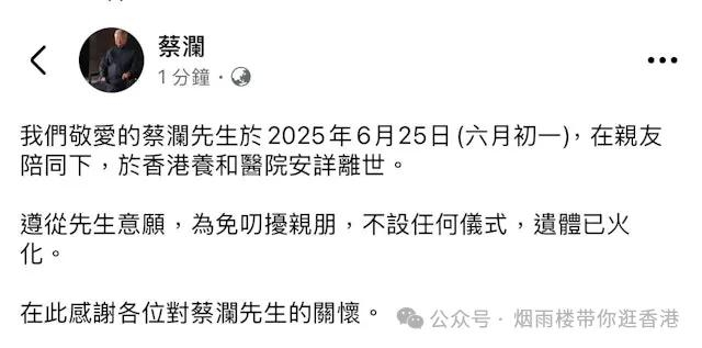 现年83岁、被誉为「香港四大才子」之一的蔡澜传出离世消息,蔡澜的社交媒体写道:「我们敬爱的蔡澜先生于2025年6月25日(六月初一),在亲友陪同下,于香港养和医院安详离世。遵从先生意愿,为免叨扰亲朋,不设任何仪式,遗体已火化。在此感谢各位对蔡澜先生的关怀。」