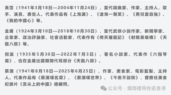 与已故的金庸、黄沾、倪匡被封为香港四大才子的蔡澜,近年传出身体欠佳。而在27日就传出他离世消息,享年83岁。及后透过他的社交网站贴文,证实该消息:「我们敬爱的蔡澜先生,于2025年6月25日(六月初一),在亲友陪同下,于香港养和医院安详离世。遵从先生意愿,为叨扰亲朋,不设任何仪式,遗体已火化。再次感谢各位对蔡澜先生的关怀。」