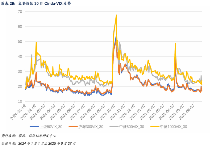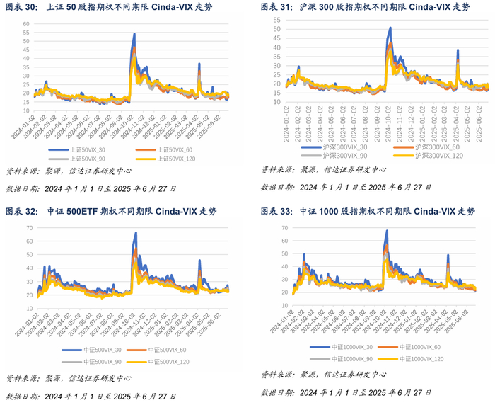 截至2025年6月27日,30日上证50VIX、沪深300VIX、中证500VIX与中证1000VIX分别为17.47、16.92、23.84及21.35。