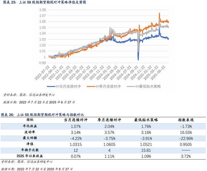 2022年7月22日至2025年6月27日,基于上证50股指期货的期现对冲策略回测结果如下图所示。