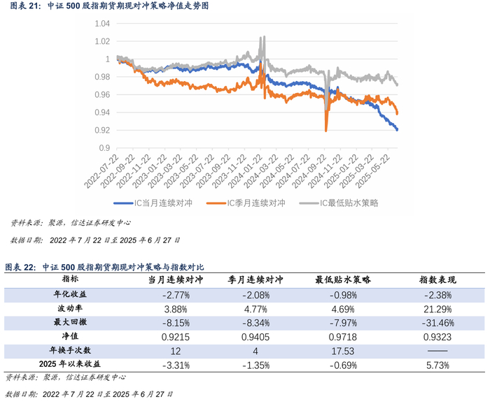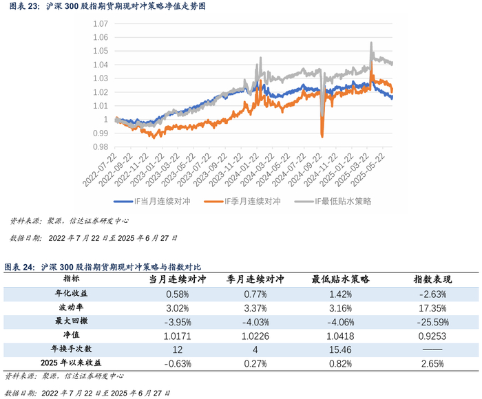 本周IC各合约基差贴水收窄,对冲策略本周出现回撤。截至2025年6月27日,最低贴水策略选择IC2507合约。