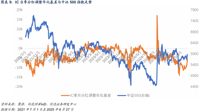 指数成分股分红对合约基差存在影响:截至2025年6月27日,本周中证500成分股中有37只股票实施分红,股息点指数上升6.19,占指数点位0.11%;沪深300成分股中有32只股票实施分红,股息点指数上升10.69,占指数点位0.27%;上证50成分股中有8只股票实施分红,股息点指数上升11.85,占指数点位0.44%;中证1000成分股中有71只股票实施分红,估算股息点约7.13,约占指数点位0.11%。指数成分股年报分红对合约基差存在影响。
