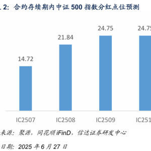 2025年6月27日,我们对股指期货标的指数未来一年内分红点位进行预测,预估中证500、沪深300、上证50、中证1000指数分红点位分别为78.03、69.93、55.49、69.32。