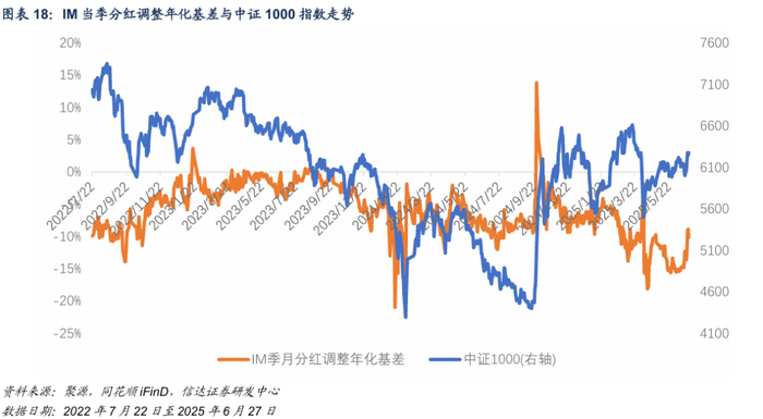 基差整体上行、贴水收敛:2025年6月27日,我们预估未来一年中证500、沪深300、上证50、中证1000指数分红点位分别为78.03、69.93、55.49、69.32。本周各品种合约基差相对上一周整体上行、贴水收敛。IC、IF、IH及IM当季合约分红处理过的年化基差分别为-6.79%、-0.79%、0.67%、-10.12%。