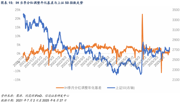 上证50指数在当月合约IH2507存续期内分红点位预估为28.11,在次月合约IH2508存续期内分红点位预估为31.02,在当季合约IH2509存续期内分红点位预估为31.88,在下季合约IH2512存续期内分红点位预估为32.3。指数在下季合约存续期内分红占比预估为1.19%。