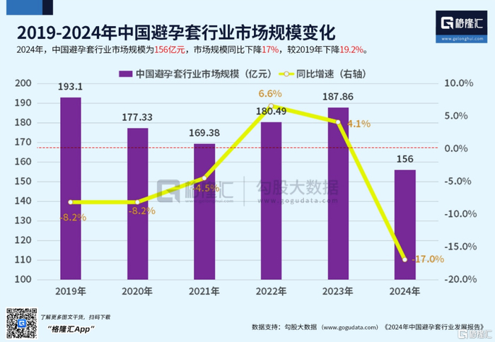 格隆直接上数据:2024年中国避孕套市场规模156亿元。这是什么概念呢?2023年避孕套卖了187.86亿元。2024年足足下降了17%——这个数据,比伟哥,更加“萧条”。