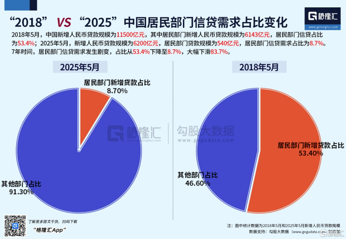 居民部门的信贷需求也在发生剧烈变化。我们仍以2018年这个拐点年做比较基准。2018年5月,居民部门新增贷款的信贷占比为53.4%;7年后的今天,2025年5月,居民部门信贷需求占比是多数呢?