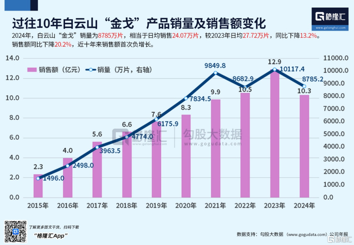 白云山年报显示,国产伟哥代表金戈的销量,从2023年的1亿片,大幅降到8785万片,日均销量则从27.7万片降到24万片,同比下降13.2%。销售额呢?从12.9亿元下降到了10.3亿元,同比降幅为20.2%。