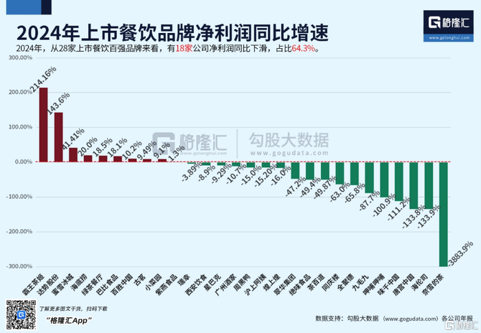 体现到行业利润上,餐饮利润大幅下滑。2024年,28家上市餐饮百强品牌中,有6家亏损,18家净利润同比增速下滑,利润增速下降的企业占比达到了恐怖的86%。