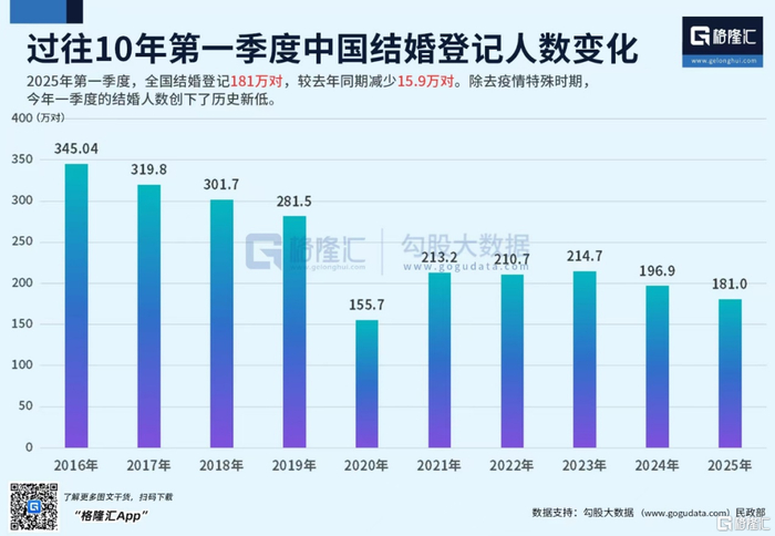 比如,结婚人数大幅减少。2025年第一季度,我国结婚人数降至181万对,较去年同期减少15.9万对。除去疫情特殊时期,今年一季度的结婚人数,果断创下了历史新低。