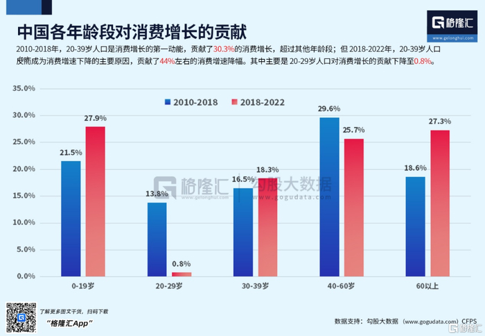 大家看一下下面这张图:2010-2018年,社零消费年复合增速为12%,2018-2022年年均增速降到了6.1%,而从不同年龄段的消费情况来看,20-39岁人口是消费增速下降的主要原因,贡献了44%左右的消费增速降幅。