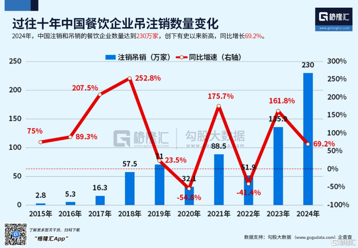 大家看看下面这个数据,很令人揪心。从图中我们可以清晰看到,2018年是个拐点。我们不值得2018年发生了什么,但数据显示,2017年以及之前,我们每年倒闭的餐饮企业只有10万家上下。但仅仅7年后,也就是2024年,当年餐饮企业倒闭数量达到了230万家,倒闭餐饮企业数量创下历史新高,是2017年倒闭数量的14倍,比上一年也就是2023年的135.9万家,也增加了近百万家,增幅高达69%,显示形势其实是在进一步恶化。