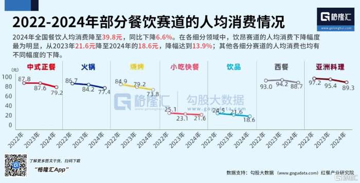 从人均消费数据来看,数据更是糟心。2022-2024年,中国餐饮人均消费值持续下滑。大家看看下面我们的数据图一。数据显示,2024年,全国餐饮人均消费已降至39.8元,这是有这个统计数据以来的历史最低值。