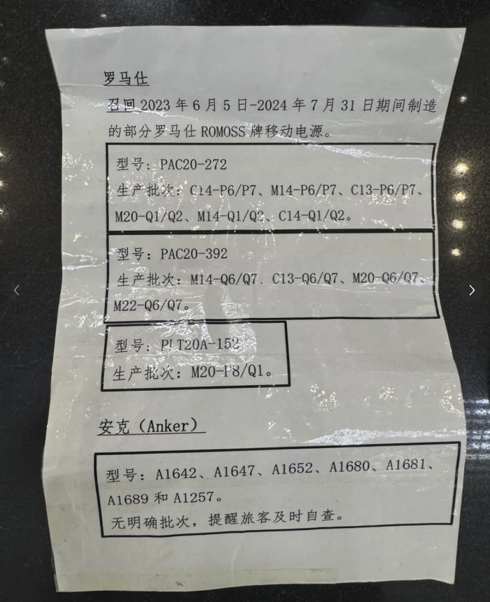 相似情况也出现在深圳宝安、三亚凤凰、沈阳桃仙等地机场。部分航空公司也在登机须知中新增“无3C认证充电宝不得随身携带”的提示项,并且已张贴型号清单,列明所有“禁带型号”,其中包括罗马仕与安克多个批次。