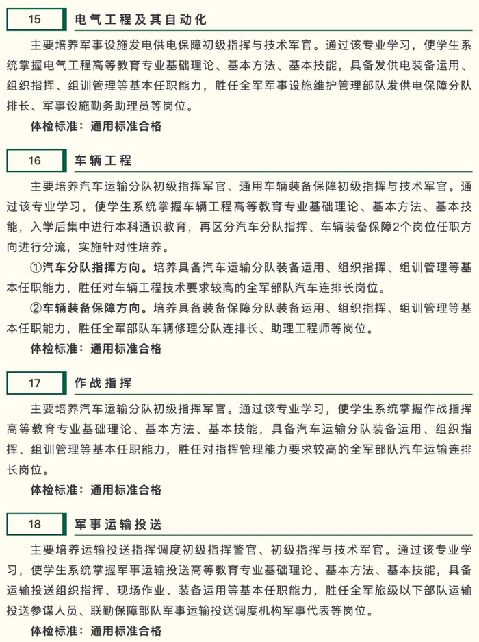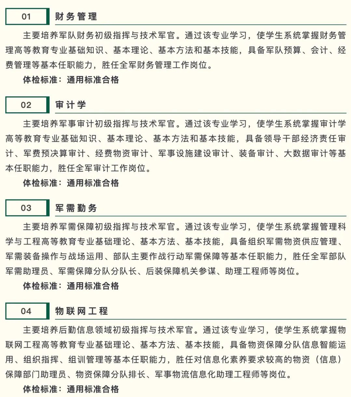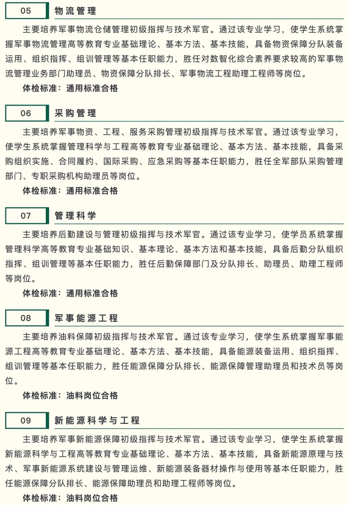 该校是一所立足联保、面向全军的综合性高等教育院校,主要面向全军后勤通用领域专业培养指挥管理、工程技术人才。21个招生专业均为四年制普通高等教育本科专业,在校期间,除完成国家高等教育本科通识课程外,还要学习政治课程、军事课程、专业课程和首次任职岗位课程,达到国家和军队本科专业人才培养质量标准,能胜任部队专业岗位。