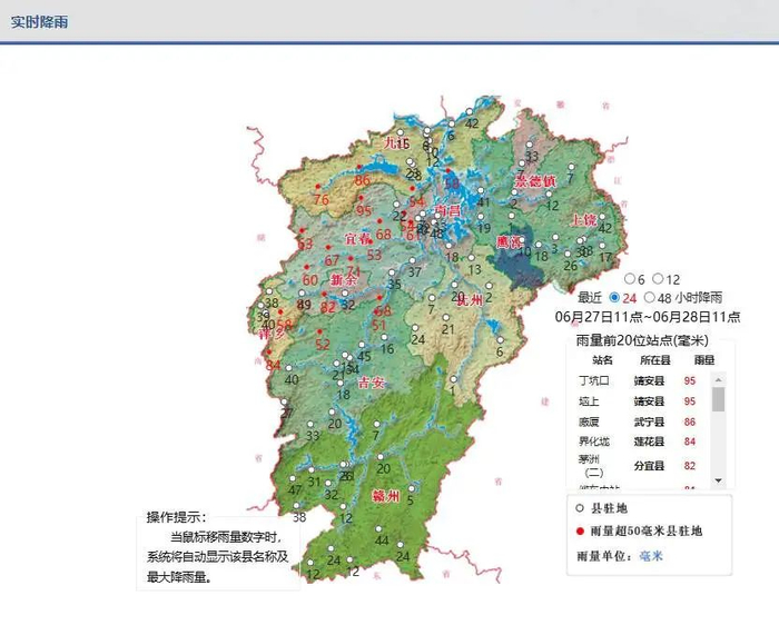 根据江西省水利厅“实时降雨”页面显示:6月27日11点到6月28日11点,全省的降雨主要集中在九江、宜春、新余和萍乡一带,其中靖安县丁坑口站雨量为最大95毫米。