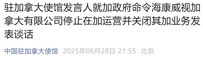 驻加拿大使馆发言人就加政府命令海康威视加拿大有限公司停止在加运营并关闭其加业务发表谈话