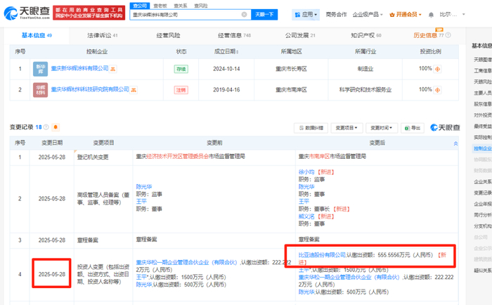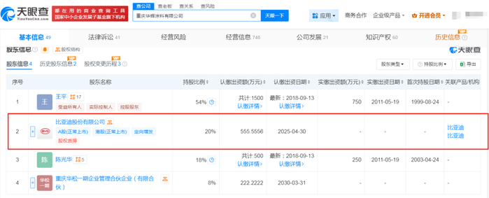近日,比亚迪收购油漆厂的传闻尘埃落定。天眼查数据显示,5月28日,比亚迪正式入主重庆华辉涂料有限公司,成为第二大股东。而在4月30日,比亚迪就完成了555.5556万元的认缴出资,持股比例达20%。此次战略投资,不仅是比亚迪全链路自研版图的重要拼图,更将为汽车涂料市场带来深远变革。