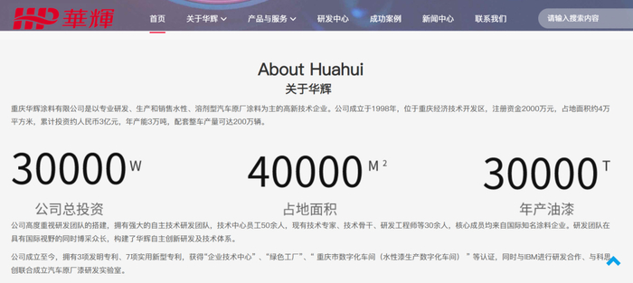 那么华辉涂料何许人也,为什么被比亚迪选中?据官网介绍,重庆华辉涂料成立于1998年,是一家集汽车涂料研发、生产、销售及“涂装一体化”服务的高新技术企业,拥有省部级科技研发平台“华辉涂料企业技术中心”,其服务网络覆盖东风纳米、奇瑞、长安、长城、SERES新能源汽车、易捷特新能源汽车、东风小康汽车、中国一汽、上汽通用五菱汽车、华晨鑫源汽车、航天成功汽车、山东鸿日新能源汽车等主流车企,并荣获重庆市“专精特新”企业、“绿色工厂”等多项荣誉,技术实力与市场口碑兼具。