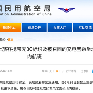 6月26日,民航局发布紧急通知,自6月28日起,禁止旅客携带没有3C标识、3C标识不清晰、被召回型号或批次的充电宝乘坐境内航班。