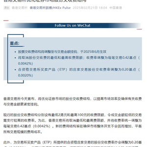 据香港交易所官方公众号,2025年2月21日,香港交易所就宣布将优化证券市场的股份交收费结构,以提高市场效率及确保有关收费与交易金额更紧密挂钩。