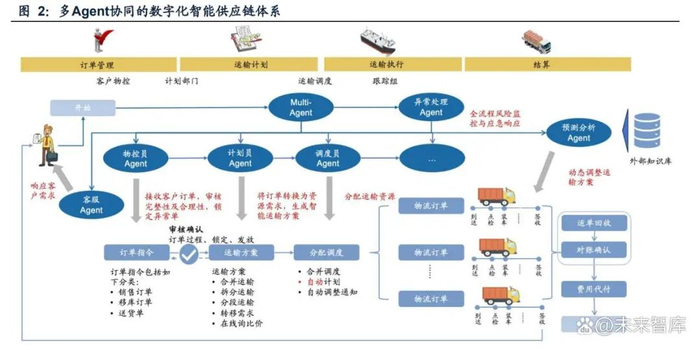 长期看AI Agent路线有望重塑ERP业务流程,可接近“指令驱动”的终局形态。AI Agent具备自主记忆、推理、规划和执行能力,而通过MCP协议等技术,可跨系统调 用工具,实现“即插即用”的资源调度。因此,未来在规则明确且数据互联互通的场 景下,用户在操作企业管理软件时,无需依赖于预设流程,便可通过指令驱动Agent 进行自主决策,实现效率提升。据金蝶国际业绩材料援引Gartner预测,到2027年, GenAI将与ERP深度融合,60%的客户在更换ERP应用程序时会选择具有平台能力 和业务流程编排能力的软件。 以一个多Agent协同的数字化智能供应链体系为例,通过Agent的分布式决策与协同 控制,可以实现供应链的动态响应与风险预判,完成从需求输入到资金偿付的全链路闭环。据IDC预测,到2028年,40%的中国头部制造商将部署基于GenAI的平台, 整合数据以模拟、评估和预测供应链风险。 具体而言,在订单管理阶段,首先由客户下单,这其中可能会涉及到在线询价、需求 定制等,由客服Agent进行处理。然后物控Agent将审核订单完整性及合理性(核验 库存、资质等),并生成订单指令。在运输计划阶段,计划员Agent将订单转换为资 源需求并生成智能运输解决方案。在运输执行阶段,则由调度员Agent对运输资源进 行分配调度并产生物流订单。最后进入结算阶段,实现货物运单回收以及对账确认 等。此外,在整个过程中,由Multi-Agent作为指挥中心,负责管理和协调生态系统内 的所有专用Agent,异常处理Agent将进行全流程风险监控与应急响应,预测分析 Agent将对整体流程进行监控优化、动态调整等。