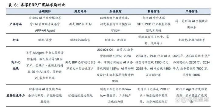 ERP厂商在GenAI时代积极拥抱AI浪潮,助力企业升级业务流程与管理范式,释放 内部核心应用场景价值。我们梳理了金蝶国际、用友网络、鼎捷数智、赛意信息和 汉得信息等国产厂商在ERP领域的AI布局,发现各家厂商在AI领域均布局较早,战 略级别高,产品多元,但在具体产品布局、行业侧重、生态合作等方面有所差异。 1. 金蝶国际:以“AI优先”战略为核心,构建“苍穹AI平台+AI管理助手+智能体” 技术架构,聚焦财务、供应链等领域。 2. 用友网络:发布企服大模型YonGPT和用友BIP企业AI,将AI嵌入企业核心业务, 为企业提供从战略规划到执行落地的全链路智能化服务。 3. 鼎捷数智:基于雅典娜平台作为数智底座,一方面,结合各行业属性持续发展与 迭代垂直行业场景应用;另一方面,推出多款通用型AI应用。 4. 赛意信息: “Agent+泛ERP”与“AI+智能制造”双轮驱动,在泛ERP领域,实现 AI能力在企业核心业务流程中的无缝集成;在智能制造领域,提供了贯穿研产供 销服全价值链的多场景产品模块服务,帮助企业实现智能化运营和管理。 5. 汉得信息:得·灵产品/服务系列全面助力企业构建AI能力体系,包括垂直领域模 型、AI中台和业务智能体以及配套服务。