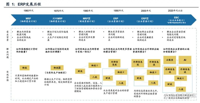 ERP(Enterprise Resource Planning,企业资源计划)是整合了企业管理理念、 业务流程、基础数据、人力物力、计算机硬件和软件的企业资源管理系统,主要包括 库存、采购、营销、BOM、车间任务管理、工艺、MRP、成本、人力资源、固定资 产等功能模块,可以帮助企业提升资源管理水平。企业应用ERP时会根据自身所处 阶段与环境设立不同的目标层次,以达到合适的管理标准。 ERP系统历经多个阶段逐渐发展成熟。ERP起源于库存管理,由MRP(Material Requirements Planning,物料需求计划)发展而来,最初是为了解决企业内部生产 资源的配置问题,主要面向制造业,用于采购管理和库存控制。在市场环境和企业 需求不断变化的背景下,MRP阶段之后又经历了闭环MRP、MRPⅡ阶段,20世纪90 年代,ERP概念被提出,随后逐步发展成熟。