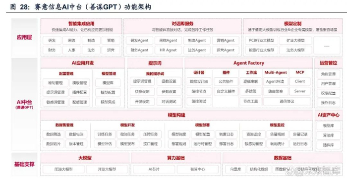 “Agent+泛ERP”与“AI+智能制造”双轮驱动。在泛ERP领域,赛意在企业核心 业务流程中无缝集成AI能力,已成功构建智能售后、智能招聘、智能投标、智能填单 等创新业务场景。在智能制造领域,赛意提供了贯穿制造业研产供销服全价值链的 多场景产品模块服务,帮助企业实现智能化运营和管理。2023年10月,赛意发布了 AIGC中台善谋GPT,定位企业智能化创新引擎,聚焦于企服和管理领域;2024年, 发布了PCB行业大模型和善谋GPT V2.0。