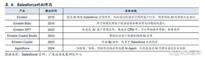 从传统AI能力构建到生成式AI创新,AI能力逐步深化。2016年,Salesforce便已推 出了Einstein,为核心应用提供AI驱动的功能增强,但主要侧重传统AI的预测与自动 化。2018年,推出Einstein Bots用于构建智能客服机器人,处理客户服务咨询。2023 年以来,又相继推出基于生成式AI的Einstein GPT、Einstein Copilot Studio、Einstein Copilot和Agentforce等,其中Einstein GPT集成在CRM中,可以帮助提升营销、销 售效率,而Agentforce用于创建AI Agent并自动化客服和销售等任务。 推出Agentforce2.0构建“无限数字劳动力”。2024年12月,Salesforce推出 Agentforce 2.0,定位为企业的数字劳动力平台,通过AI Agent为各部门提供自动化 支持。Agentforce 2.0核心在于结合增强推理引擎、预置技能库及跨系统集成能力, 为企业打造可定制、可扩展的“无限劳动力”,帮助其优化效率并释放增长潜力。