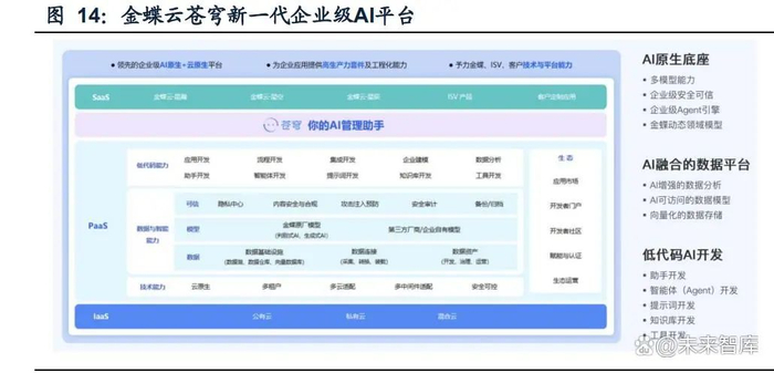 AI优先,驱动企业管理升级。金蝶以“All in AI”为核心战略,自2017年起便开始布 局AI创新,构建了从AI底座,到数据平台再到终端应用的完整体系,重点突破财务、 人力等高价值场景落地。整体看,金蝶通过“企业级AI平台(企业可快速开发AI应 用)”+“AI管理助手及苍穹APP”+“AI Agent”等模式来逐步深化AI应用。金蝶 云·苍穹升级为新一代企业级AI平台,发布AI管理助手及苍穹APP,并提供丰富场景 的AI Agent,为企业提供快速高效使用AI的解决方案。