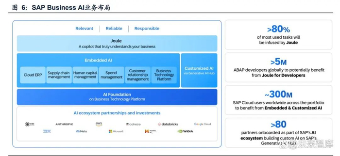 SAP的Business AI解决方案可分为AI Foundation + Embedded AI / Customized AI + Joule三层。具体而言,①AI Foundation基于SAP BTP(业务技术平台)所开 发,为开发者提供标准化可复用的AI开发工具链,降低企业自建AI的门槛;② Embedded AI直接嵌入云ERP、供应链管理等SAP现有核心产品,直接提供AI功能, 无需额外开发,快速实现降本增效;③Customized AI通过Generative AI Hub实现灵 活扩展,支持企业根据需求定制AI解决方案;④智能助手Joule则可以通过自然语言 交互简化复杂系统操作,目前已经渗透80%高频任务。此外,生态方面,通过与 Anthropic、Cohere、Meta等AI大模型厂商以及AWS、Google、Microsoft等云厂商 建立良好的合作关系,赋予开发者灵活调用前沿模型的能力。