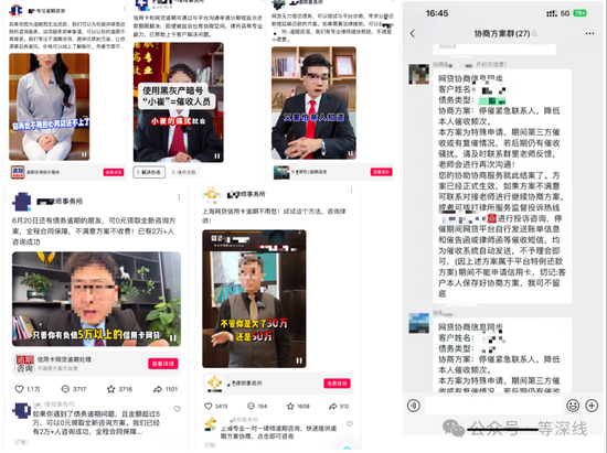 某短视频平台上,这家开设于广东的“律所”,宣称其成功处理过多件逾期高达几十万元的贷款案例。在广告页面,“现在有信用卡、网贷逾期的恭喜你了,可以免费咨询”的标语异常醒目。