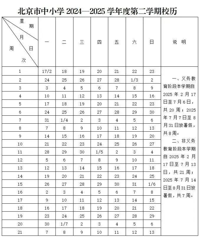 根据北京市中小学2024—2025学年度第二学期校历——