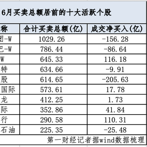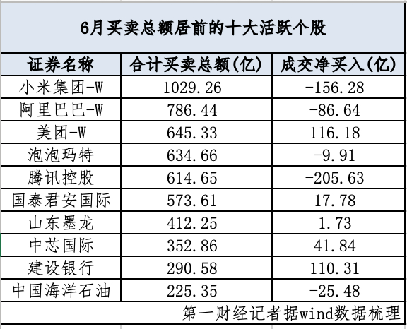 从6月份前十大活跃个股看,共有377只个股上榜。记者据Wind数据梳理,本月港股通成交买卖总额最高的为小米集团-W、阿里巴巴-W、美团-W,分别为1029.26亿港元、786.44亿港元、645.33亿港元。此外,泡泡玛特、腾讯控股、国泰君安国际、山东墨龙、中芯国际本月的港股通成交买卖总额也超过300亿港元。