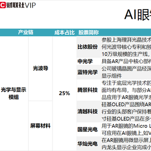 据财联社VIP盘中宝•数据栏目此前梳理,在AI眼镜产业链中,光学与显示模组领域成本占比25%,涉及上市公司包括比依股份、中光学、蓝特光学、腾景科技、清越科技、国星光电和华灿光电,具体情况详见下图: