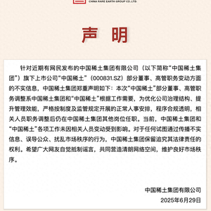 6月29日午间,央企中国稀土集团发布声明。中国稀土集团表示,针对近期有网民发布的中国稀土集团有限公司(以下简称“中国稀土集团”)旗下上市公司“中国稀土”(000831.SZ)部分董事、高管职务变动方面的不实信息,中国稀土集团郑重声明如下:本次“中国稀土”部分董事、高管职务调整系中国稀土集团和“中国稀土”根据工作需要,为优化公司治理结构、提升管理效能,严格按制度及监管规定开展的正常人事安排,程序合规透明,相关人员职务调整后仍在中国稀土集团其他岗位任职。当前,中国稀土集团和“中国稀土”各项工作未因相关人员变动受到影响。