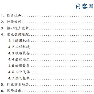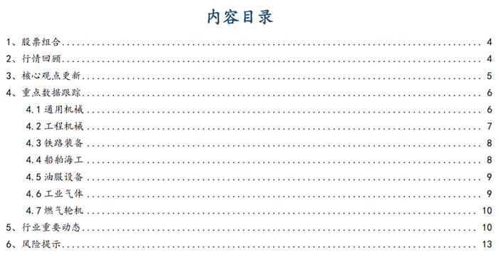 细分行业景气指标:通用机械(持续承压)、工程机械(稳健向上)、船舶海工(持续承压)、油服设备(底部企稳)、铁路装备(稳健向上)、燃气轮机(稳健向上)。