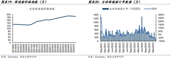 船舶海工景气度持续承压。截至2025年5月,全球新造船价格指数为186.69,环比下滑0.22%。从船舶20年大周期的维度看,当前仅仅为上行周期中的短期波动,是符合历史规律的,例如上一轮上行周期在2005年下半年也出现了短期回调现象。所以从长周期来看,我们依然看好船舶周期持续上行,未来造船价有望持续提升。另外,如果从3-6个月的短周期来看,目前月度船价环比仍下滑,景气度仍持续承压,静待船价环比上涨。
