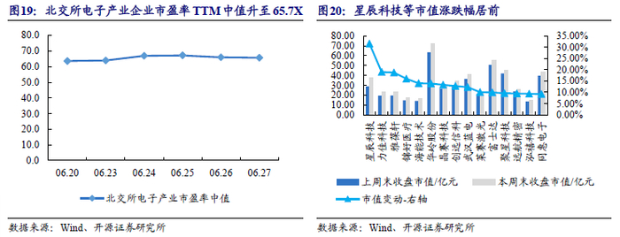 本周,从估值表现看,北交所电子产业44家企业的市盈率TTM中值升至65.7X。从本周个股市值表现来看,星辰科技+31.63%、力佳科技+19.02%、雅葆轩+18.77%分列市值涨跌幅前三甲。(电子公司类别:包含消费电子、医疗电子、新能源电子设备、仪器仪表等细分行业)