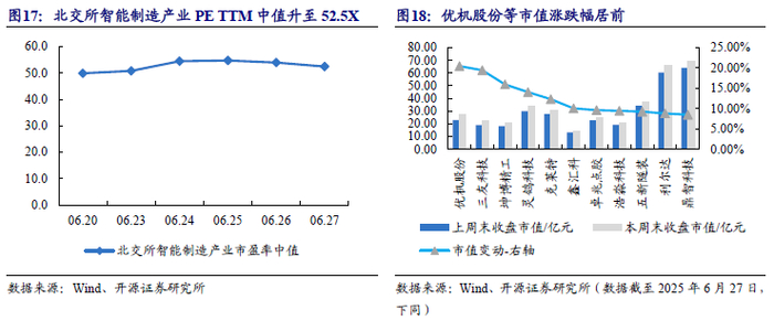 本周,从估值表现看,北交所智能制造产业53家企业的市盈率TTM中值升至52.5X。从本周个股市值表现来看,优机股份+20.46%、三友科技+19.47%、坤博精工+15.96%分列市值涨跌幅前三甲。(智能制造公司类别:包含机械设备、机械零件制造、军工制造、交运设备、电气设备等细分行业)