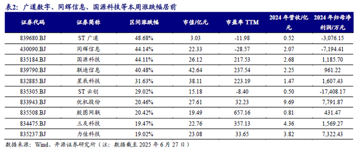 本周(2025年6月23日至2025年6月27日),前十大涨跌幅标的分别是广道数字、同辉信息、国源科技、联迪信息、星辰科技、ST云创、优机股份、殷图网联、三友科技、力佳科技。