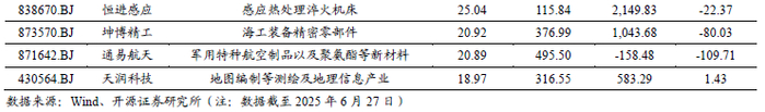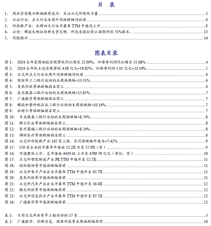 2025年6月24日国务院新闻办公室新闻发布会宣布,9月3日上午将举行纪念中国人民抗日战争暨世界反法西斯战争胜利80周年大会(包括检阅部队)。这次阅兵,受阅的武器装备全部为国产现役主战装备,是我军体系作战能力、新域新质战力、战略威慑实力的集中展示,是我国武器装备自主创新能力的集中体现。目前北交所共有军工相关标的17家,截至2025年6月27日总市值达到734.34亿元。星图测控(920116.BJ)是围绕航天器在轨管理与服务,专业从事航天测控管理、航天数字仿真的国家级专精特新“小巨人”企业。民士达(833394.BJ)主要产品“芳纶纸”是一种由高性能芳纶纤维制成的非织造布材料,该产品具有阻燃、绝缘、高强度、抗腐蚀、耐辐射等诸多特性广泛应用于电力电气、航空航天、轨道交通、新能源、电子通讯、国防军工等重要领域。