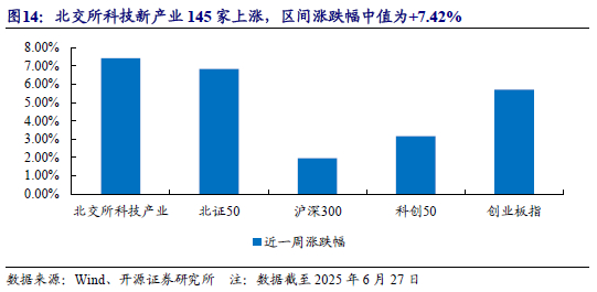 从周度涨跌幅数据来看,2025年6月23日至2025年6月27日,北交所科技新产业150家企业中145家上涨,区间涨跌幅中值为+7.42%,广道数字+48.68%,同辉信息+44.14%,国源科技+44.11%,联迪信息+40.48%,星辰科技+31.63%位列涨幅前五。北证50、沪深300、科创50、创业板指周度涨跌幅分别为+6.84%、+1.95%、+3.17%、+5.69%。